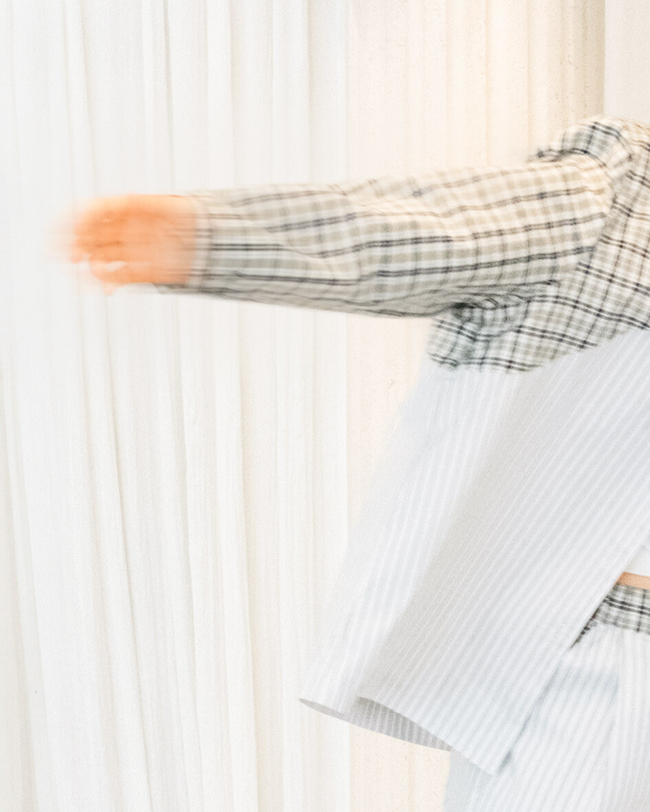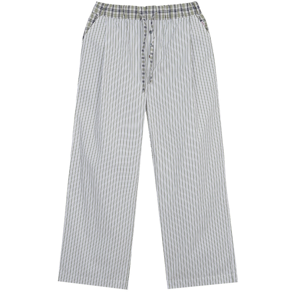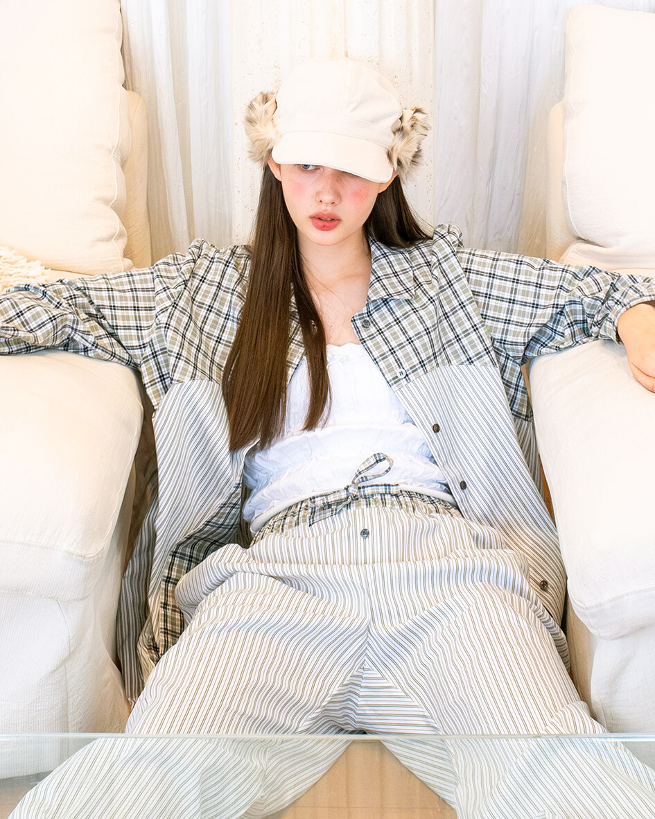 - 허리 핀턱으로 여유로운 핏의 바지와 스트링으로 조절 가능한 허리 사이즈